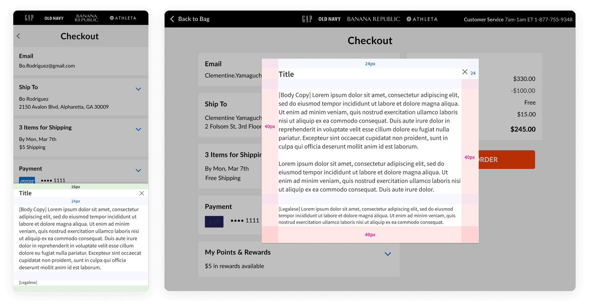 All of Gap Inc's brands — Gap, Old Navy, Banana Republic, and Athleta — share an eCommerce platform that allows customer to add items from the different brands into the same bag for a single checkout experience. The complexities of supporting 4 different brands, along with the piecemeal addition of new checkout features over the last few years (e.g., PayPal, pickup in store, gift message, rewards) resulted in a hodge-podge, scotch-taped, one-size-fits-all experience that frustrated customers.